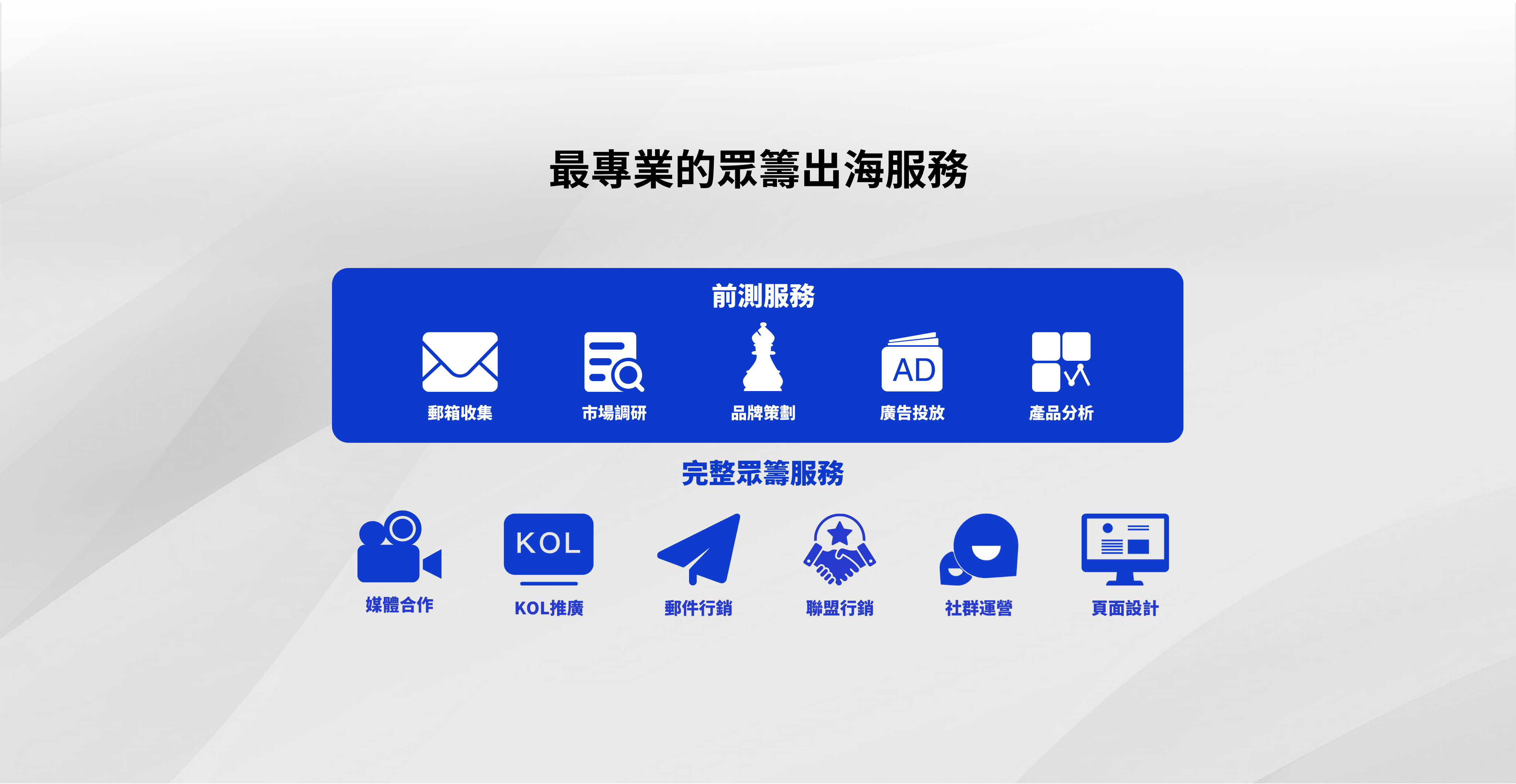 依研究結果的量身訂做:產品Landing Page頁⾯設計、廣告拍攝,電子郵件行銷,社群平台運作等。